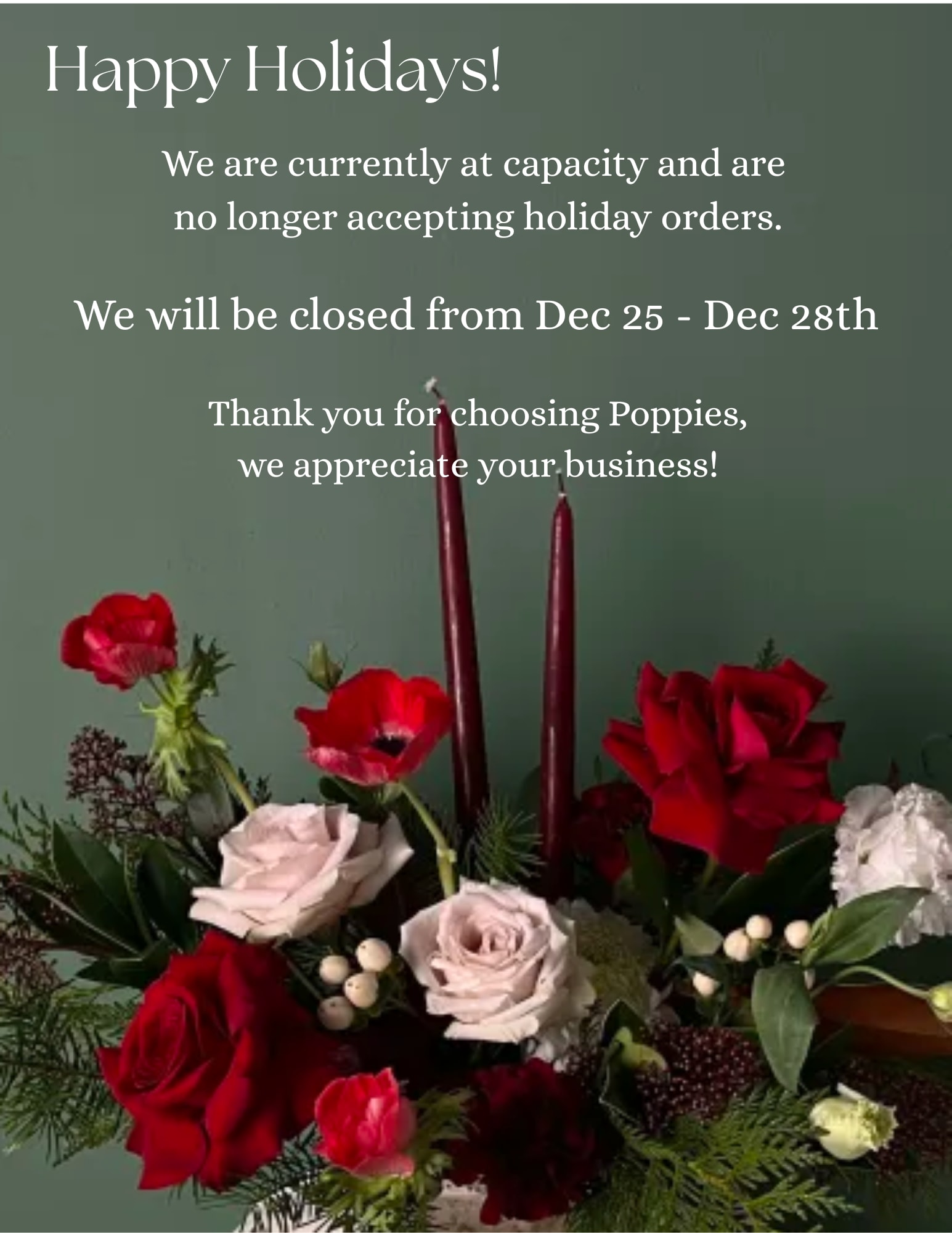 All of Poppies' arrangements and bouquets were created and photographed by Poppies staff